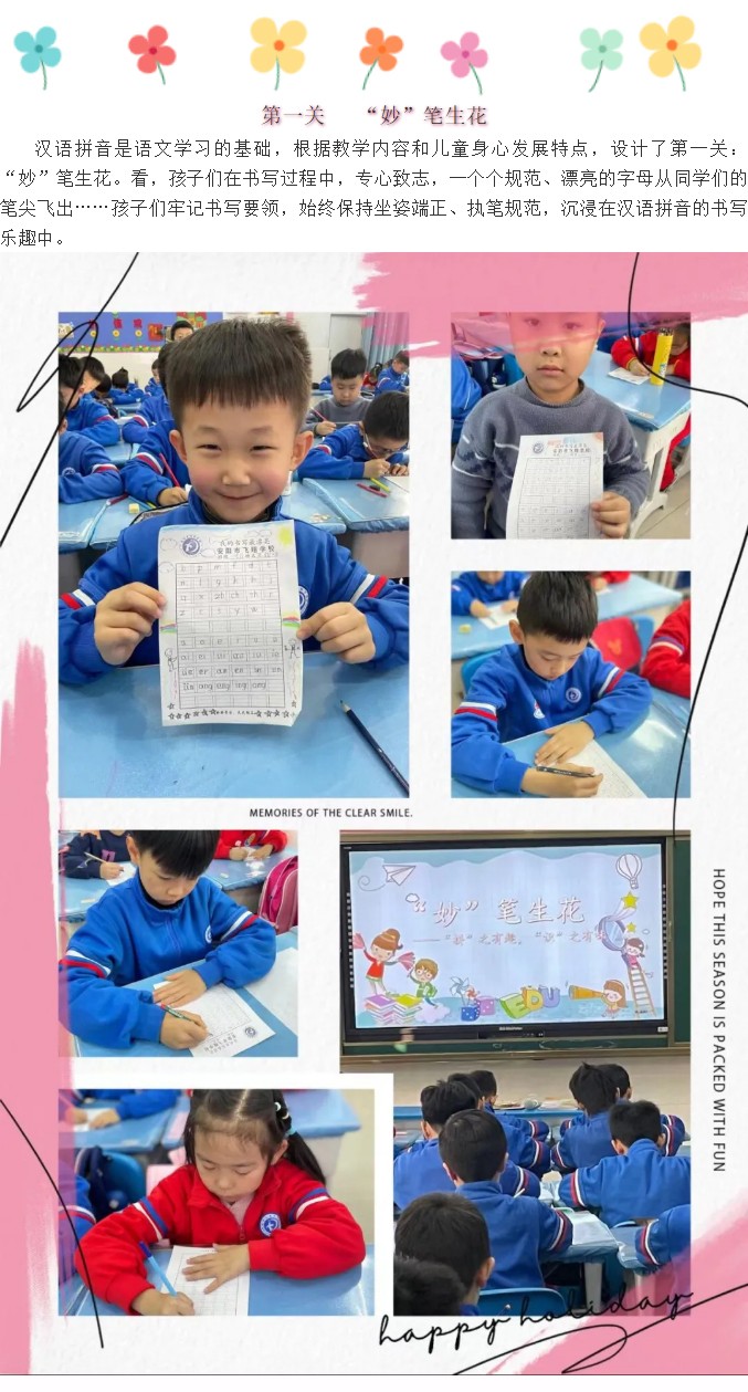為有效落實“雙減”背景下的幼小銜接工作,在減負增效的前提下幫助一年級孩子盡快適應小學階段的學習和生活,幫助孩子快樂銜接,做到“零起點,齊步走,看得見”。一年級開展的“拼音識字大闖關”,充分激發了孩子們的樂學天性,力求通過多樣化、趣味化的游戲活動,激發學生學習興趣,培養學生在生活中運用知識的能力。讓萌娃們在活動中成長,在實踐中收獲!真正做到“拼”之有趣,“識”之有味!